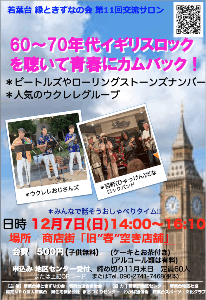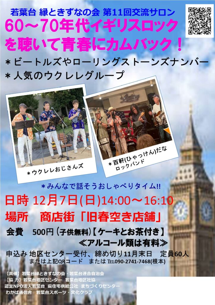 若葉台縁ときずなの会では、12月7日(日)、第11回交流サロンを開催します。