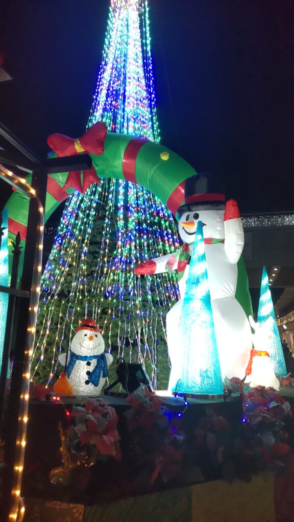 今年のツリーがパッと華やかに彩られ、ツリーのまん中には大きなスノーマンが・・・。子どもたちの人気になりそうです。ツリー前には素敵なベンチがあり、写真撮影のベストスポットになりそうです。