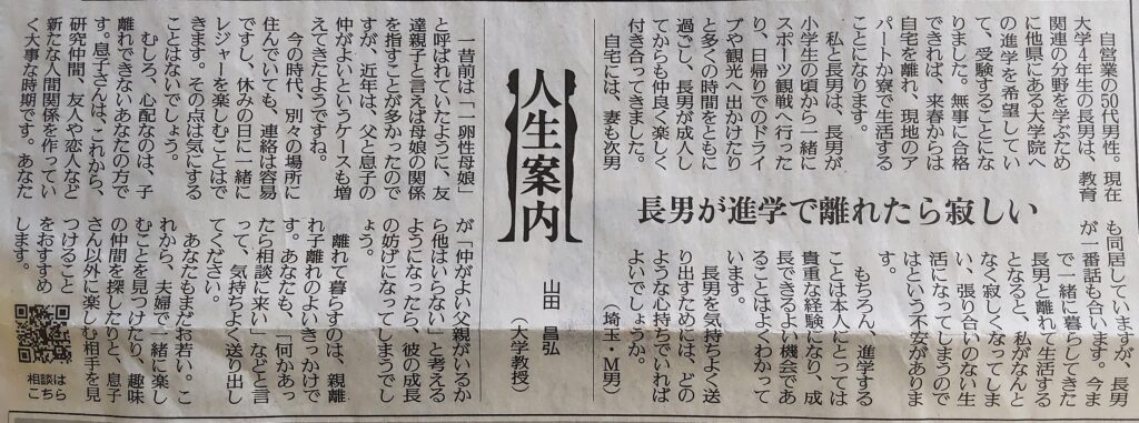 たまたま新聞の人生案内で、50代くらいの男性の悩みを見ました。
