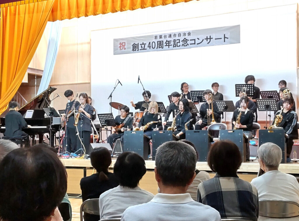 2025年9月23日 には、40周年記念コンサート第3弾として、洗足学園音楽大学のビッグバンドジャズサークル しわしわ~ず の皆さんが若葉台を訪れ、多彩なジャズナンバーを披露。軽快で楽しいジャズ演奏に会場が盛り上がりました。