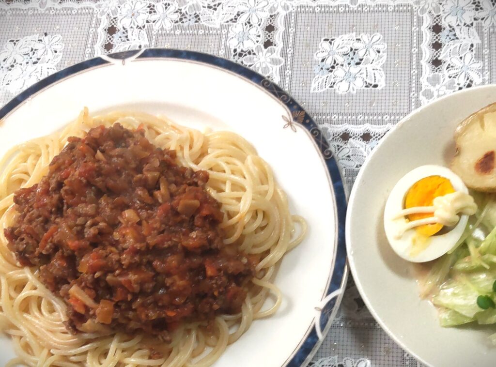 ミートソーススパゲッティ2日目。だんだん手抜きで、同じ献立の連続がふえてきました