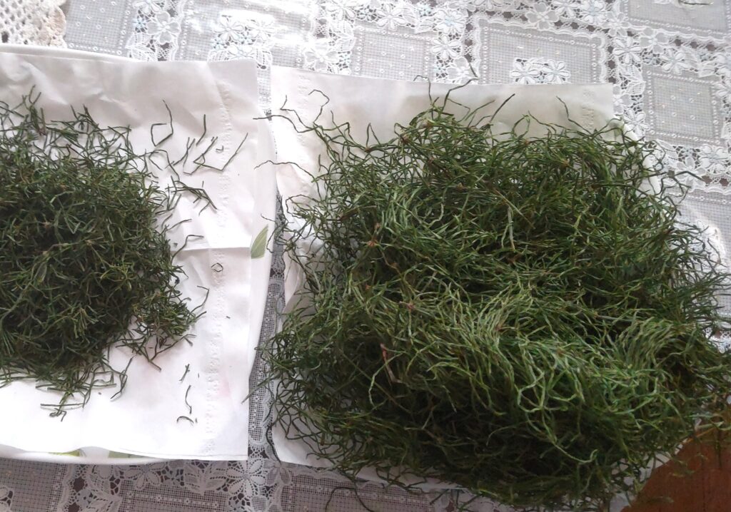 そして大量につんできたスギナを水でジャブジャブ洗い、網に入れて軒に吊るすまでが今日の仕事。二日ほど干して乾かしておきます。